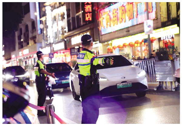 ▲“五一”假期,阳朔西街车流量激增。图为交警在疏导交通。(市交警支队供图)