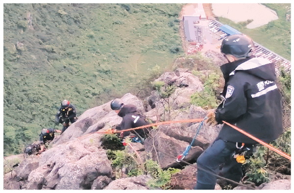 山崖峭壁,几乎无路可以通向被困人员位置。救援队在岩壁附近以一块坚固岩石建设锚点,警员与消防救援队员做好安全措施后,携带救援装备利用绳索下降器和静力绳,从一侧悬崖缓慢下降至被困人员处,进行提拉救援。