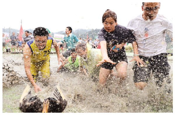 在追鸡逐鸭活动中,选手们你追我赶、斗智斗勇,有的采用迂回包抄战术,有的则直接勇猛冲刺。“我先抓到的!”“我也扯到翅膀了!”只见田中一个个泥人跑动争抢,现场热火朝天、鸡飞鸭跳的场面让人乐翻了天。