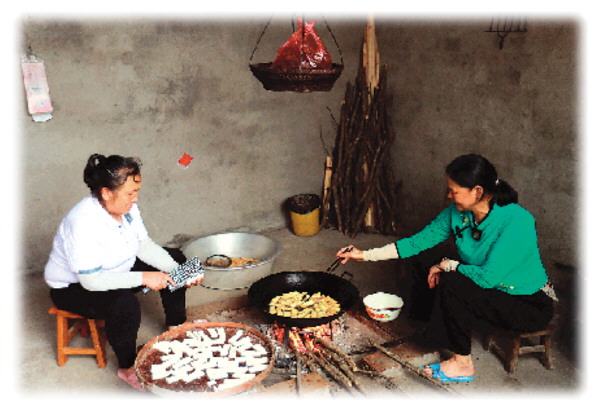 制作当日,时凤平起了个大早,把豆子做成了白嫩的水豆腐。接着,她把水豆腐切成自己喜欢的小长方块,再用茶油炸至金黄色。在当地人看来,茶油是油炸豆腐最佳的食用油。猪油过于油腻,其他植物油少了那种茶树特有的清香,唯有自家收获的茶油,既富含丰收的喜悦,也能应付味蕾的挑剔。
