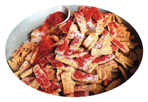把食盐、辣椒粉和高度酒等倒入油炸豆腐中,均匀搅拌,用以调味。 记者李忠波 秦丽云 摄