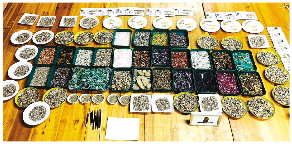 作画用的漓江石、桂林鸡血玉,邓凤竹和吕珊蔚都尽可能地亲自到漓江河床和开采地去挑选,而一幅稍大些的作品动辄就是成千上万颗石头,来回跑几趟是常有的事。为了找到适合的材料,两人走遍了桂林的山川。