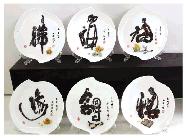 除了常规做于纸上的石画,邓凤竹及其团队还将石画在不同载体上进行呈现,如做于扇子上、瓷盘上,茶壶上……数以万计的石头碎块在匠人的巧手下,成了一件件形态各异的石画作品,焕发光彩。