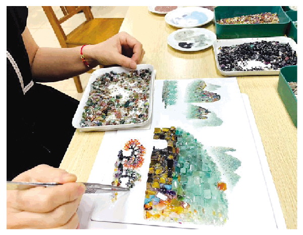 图⑦:画面的细节呈现需要挑选小颗粒的石头,吕珊蔚正在用镊子仔细粘贴。
