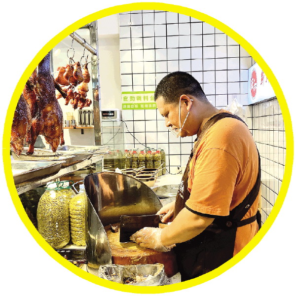 秦建宗正在斩烧鸭,并将多余的皮脂取掉,将口感最佳的烧鸭呈现给顾客。
