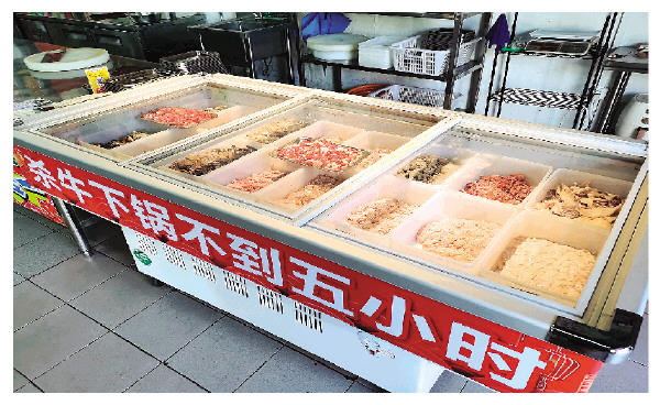 两江牛佬牛八宝店的菜品放在保鲜柜里。