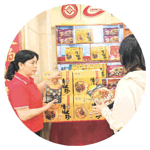 梁玉珍(左)给游客介绍礼盒装的米粉。
