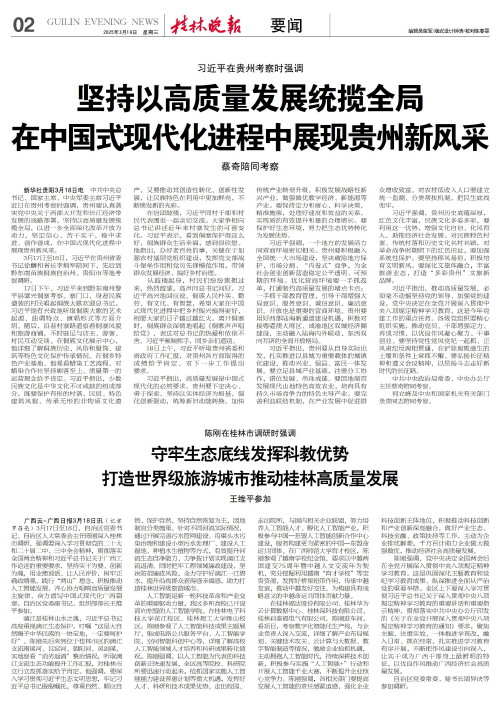 在中国式现代化进程中展现贵州新风采 蔡奇陪同考察   新华社贵阳3月18日电 中共中央总书记、国家主席、中央军委主席习近平近日在贵州考察时强调,贵州要认真落实党中央关于西部大开发和长江经济带发展的战略部署,坚持以高质量发展统揽全局,以进一步全面深化改革开放为动力,坚定信心、苦干实干,稳中求进、善作善成,在中国式现代化进程中展现贵州新风采。