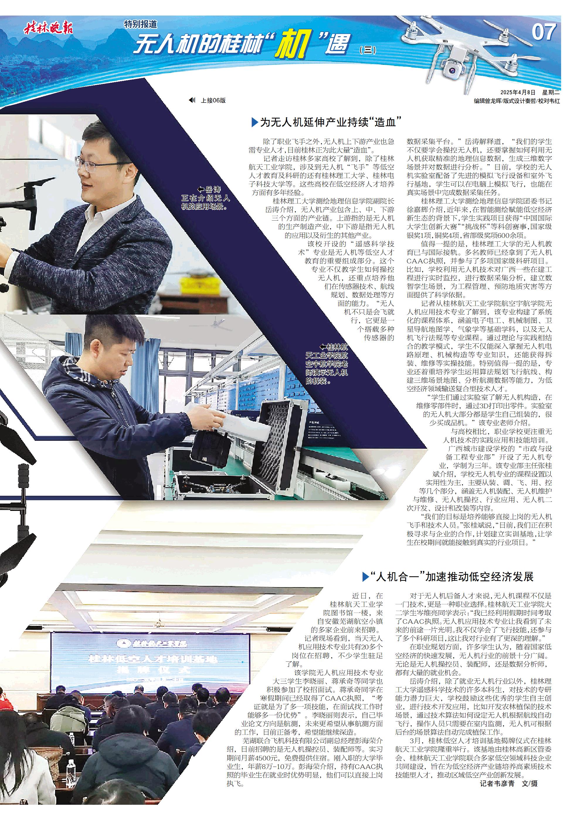 记者走访桂林多家高校了解到,除了桂林航天工业学院,涉及到无人机“飞手”等低空人才教育及科研的还有桂林理工大学、桂林电子科技大学等。这些高校在低空经济人才培养方面有多年经验。