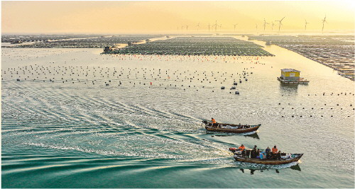 ▲2022年12月31日,在山东省荣成市石岛管理区桑沟湾海洋牧场,渔民们驾驶渔船前往网箱养殖区进行作业(无人机照片)。