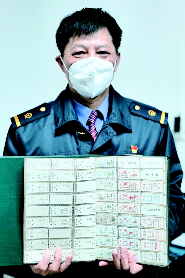 莫品全向记者展示几十年来我国火车票的样式变迁。记者苏展 摄