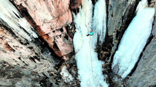 1月8日,在云梦山景区,攀冰爱好者在冰壁上攀爬(无人机照片)。