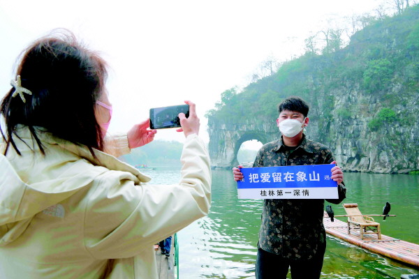 来自河南的游客手举着“把爱留在象山”的牌子,开心地与桂林城徽象鼻山合影。