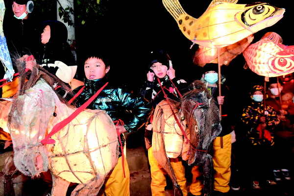 夜幕降临,大号声、锣鼓声、鞭炮声先后响起,叶明德撑着龙伞走在最前面,把两条黄龙“请”到村口球场。随着舞龙灯人时而急速前进、时而缓慢前行的脚步,黄龙时而被拉成一条直线,时而盘绕成一团,收放自如,变化多端。小孩们则在身上套着骏马造型的花灯或举着虾、鲤鱼等造型的花灯,跟在黄龙身旁,围绕着黄龙奔跑。欢呼声此起彼伏,响彻夜空。