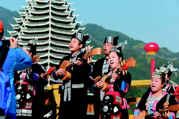 龙胜平等侗寨群众弹唱琵琶歌迎宾。