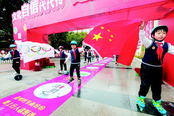 育才小学的小轮滑旗手们展示轮滑技术。记者陈静 摄