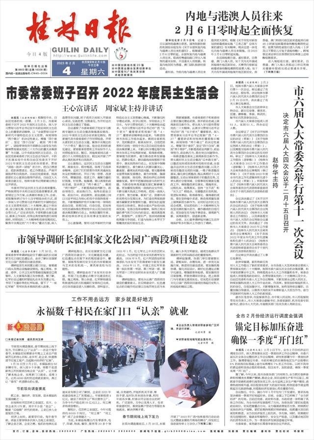 周家斌强调,市委常委班子和常委同志要在强化理论武装、筑牢政治忠诚上展现新担当新作为。带头深入学习宣传贯彻党的二十大精神,认真学习贯彻习近平总书记对广西“五个更大”重要要求,深入贯彻落实习近平总书记视察广西“4·27”重要讲话和对桂林的重要指示精神,深刻领悟“两个确立”的决定性意义,增强“四个意识”、坚定“四个自信”、做到“两个维护”,不断提高政治判断力、政治领悟力、政治执行力。要在突出问题导向、一体推进整改落实上展现新担当新作为。带头做好民主生活会整改“后半篇文章”,以整改实际成效体现对党绝对忠诚。全面盘点这次民主生活会的整改问题,以及之前没有整改完成的问题,一揽子推进整改落实。强化责任抓整改,既认真抓好个人问题整改,主动认领常委班子的整改任务,又牵头抓好分管领域、分管事项反馈意见整改工作,确保整改责任落实、措施务实、过程扎实、结果真实。坚持“当下改”和“长久立”相结合,完善整改长效机制,促进标本兼治,取得看得见、摸得着的成效。要在坚持稳中求进、推动高质量发展上展现新担当新作为。运用好这次民主生活会成果,切实把党的二十大精神转化为攻坚克难的强大动力、善作善成的自觉行动,更加奋发有为地干事创业,展现新气象、实现新提升、创造新业绩。
