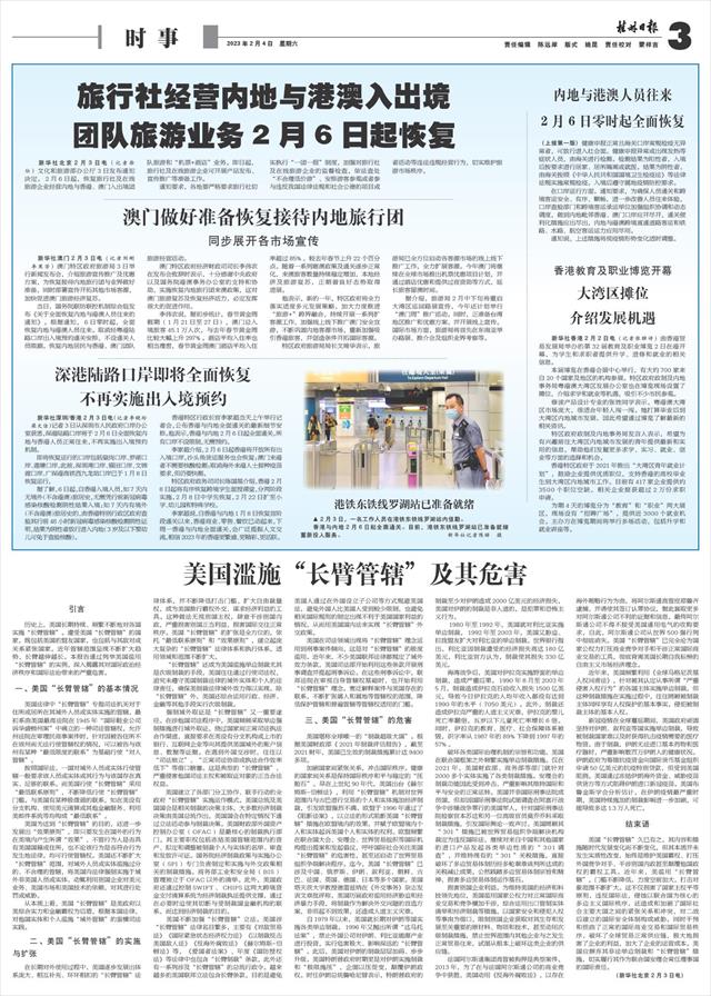 新华社北京2月3日电 记者3日从国务院港澳办获悉,国务院联防联控机制综合组发布《关于全面恢复内地与港澳人员往来的通知》。根据通知,2月6日零时起,全面恢复内地与港澳人员往来。取消经粤港陆路口岸出入境预约通关安排,不设通关人员限额。恢复内地居民与香港、澳门团队旅游经营活动。