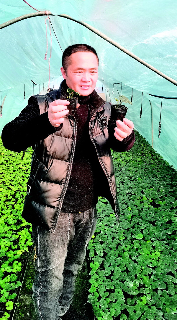 程小明展示长势喜人的罗汉果苗。 记者秦丽云 摄