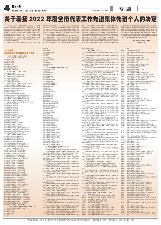 为表扬先进、树立典型,激励全社会关心支持人大工作,支持和保障人大代表依法履职,经市人大常委会研究,决定对灵川县人大常委会等81个2022年度全市代表工作先进单位,市人民政府办公室等60个2022年度全市代表建议办理工作先进单位,粟开俭代表提出的“关于加强漓江流域生态保护监管工作的建议”等60件2022年度全市优秀代表建议,丁白茹等100名2022年度全市人大代表“履职之星”予以表扬。