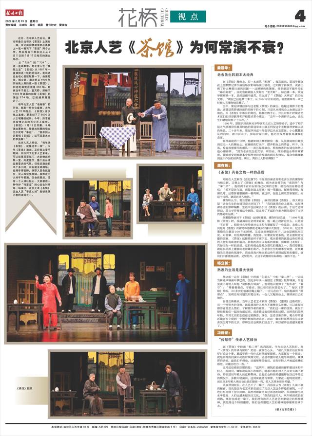 从演员到院长,在人艺干了一辈子,冯远征认为《茶馆》久演不衰的秘密,首先是因为老艺术家们创立了北京人艺这个辉煌的剧院,一手把它打造成了金字招牌。虽然戏剧曾经有过低迷的阶段,但是随着生活水平提高,人们也越来越关注文化。“像我们这代人,从年轻到成长到成熟,现在也成老一辈了。我们没有放弃人艺老艺术家创立的那些精神,我觉得这个特别重要,我们也希望把人艺的精神能够继续传承下去。”