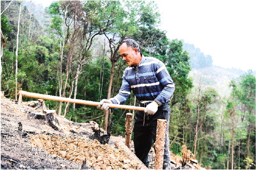 村民在山坡上、荒地里炼山整地、清杂除草、备桩栽桩。秦榛 摄