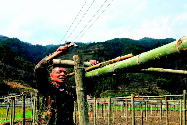 图⑤:龙胜各族自治县马堤乡芙蓉村村民正在果园里打桩。