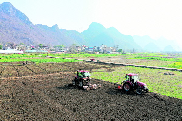 图①:灵川县定江镇莲花村的农民忙着翻耕施肥。