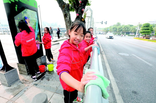 ▲“红领巾”们细心地用抹布擦拭着护栏和路牌。近日,市中华小学四年级3班的同学们到滨江路开展学雷锋活动,用实际行动践行雷锋精神,争做新时代好少年。 记者陈静 摄