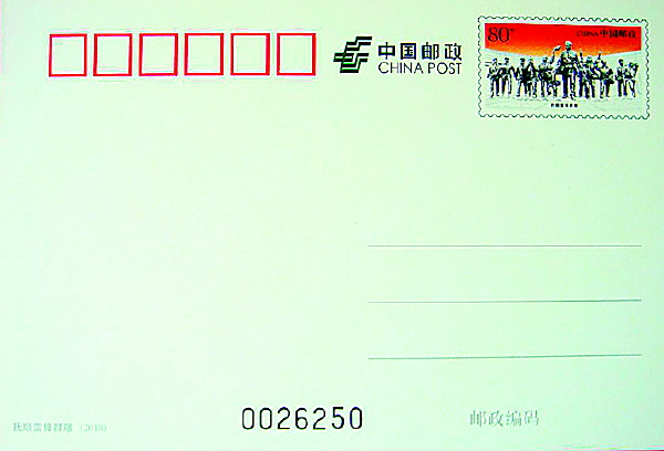 2018年3月发行的《抚顺雷锋群雕》普通邮资明信片一套1枚(图8)。邮资图以雷锋纪念馆内“雷锋与少先队员”群雕为主元素,采用雕塑正面主体形象,使雕塑显得更加厚重和雄伟。背景用红黄色渐变衬托出雕塑的夺目光彩,唤起了人们对雷锋的追忆和怀念。