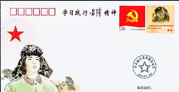 2012年3月发行的《学习践行雷锋精神》特种纪念封1枚(图6),纪念封用水墨绘画形式手绘了雷锋的典型形象,贴雷锋个性化邮票,主图为党旗邮票,附票是雷锋工作照,照片下方印有雷锋“我要把有限的生命,投入到无限的为人民服务之中去”的手迹。