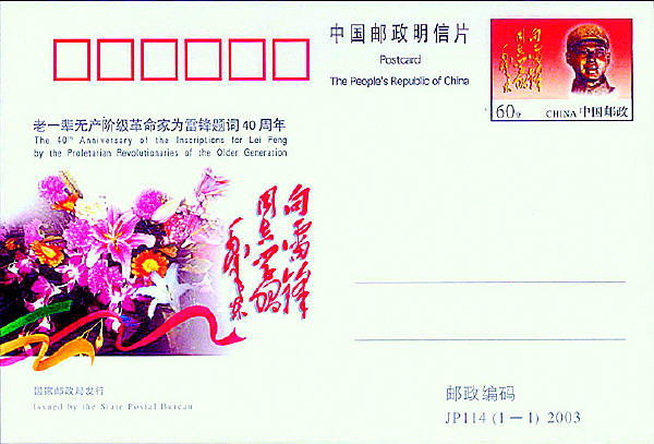 2003年3月5日发行的《老一辈无产阶级革命家为雷锋题词40周年》纪念邮资明信片一套1枚(图5),明信片上有两处毛主席的“向雷锋同志学习”题词,一处置于邮资图内雷锋像的左侧,一处位于明信片正中,鲜红色重影立体的手迹衬以鲜艳花束,显得格外醒目。