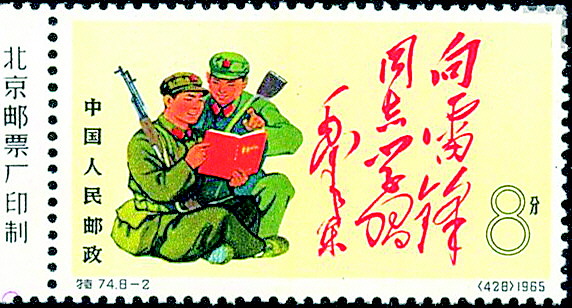 1965年8月1日,原邮电部发行的《中国人民解放军》特种邮票的第2枚“五好战士”(图2),邮票画面左侧是两位战士在捧读“雷锋日记”,右侧印有毛泽东“向雷锋同志学习”的题词。