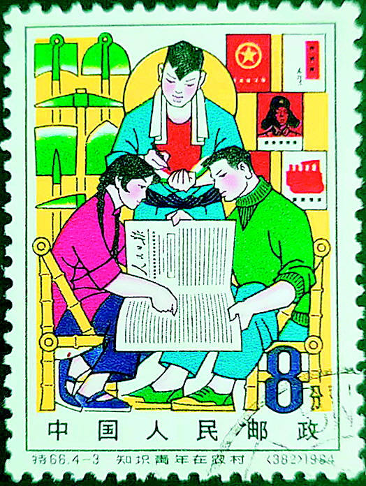1964年9月26日,原邮电部发行的《知识青年在农村》特种邮票的第3枚“学习”(图1),邮票画面是三位青年在看《人民日报》,背景中的书架上摆放着一本《雷锋的故事》,封面为雷锋头像。