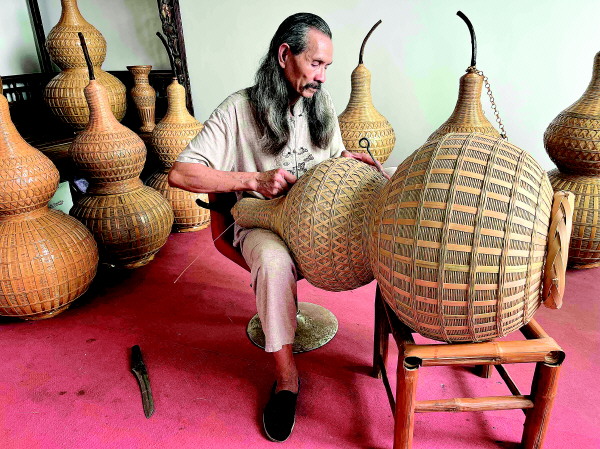 在永福苏桥,60岁的黄增才说,从他的爷爷辈起,家里就传承着竹编手艺,从最初的渔具到农耕用的箩筐、簸箕,再到如今他痴迷的葫芦,都能在手里编出来。“孩子们大了在外面上班,我闲不下来,想要把这门手艺传承下去。”黄增才把家里当成了工作室,厅堂、楼梯转角都有葫芦装饰,还有专门的一个房间来放他的葫芦。一根竹子经过劈、削、拉,可以拉出上千条篾丝。竹篾按照一定的编织方式一层一层起底,在编出了葫芦形状后,在上面还可以变化出近20种手法,编出不同的花纹,如麻花编、格纹编等。一个高一米左右的葫芦大约需要20天才能编完,葫芦大多被顾客提前预订。看到竹编葫芦深受人们喜爱,黄增才的儿子也开始在工作之余学起了这门手艺,“传统手工艺越来越受到人们的重视,今后大有可为”。