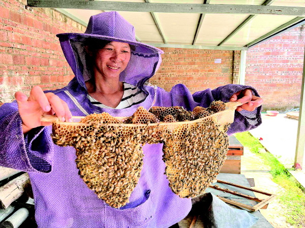 ▲阳朔县杨堤乡脱贫户叶德华在自家院子里养蜂。