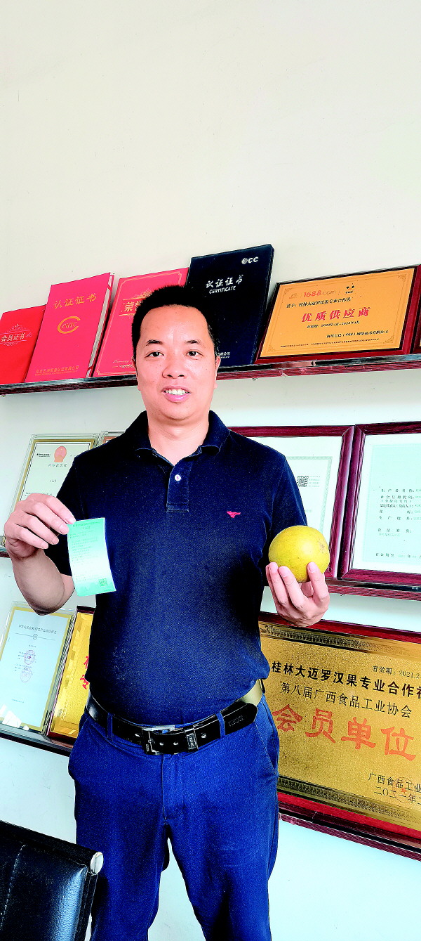 桂林大迈罗汉果专业合作社负责人黄成发展示该合作社生产的罗汉果和相应的合格证A证。黄成发说,一张合格证,为他们的产品在食品安全方面的合格做出了最好的证明。记者秦丽云 摄