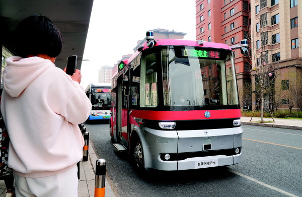 3月20日,智能网联巴士901线测试车在河北雄安新区容东片区道路上停靠。
