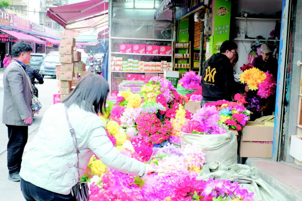 按照传统习俗,清明祭祀先人少不了檀香、黄纸等用品。记者在桂林玉龙虞山批发城和中山北路一带的多家商铺看到,选购祭祀用品的人逐渐多了起来,买绢花的人占大多数,绢花价格在每支6元至10多元不等。