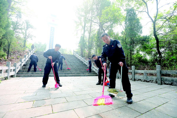 清扫落叶,整理烈士纪念碑前的花圈和鲜花……清明节前夕,桂林市人民警察训练学校的在训学员们到苏蔓等三烈士纪念碑园进行缅怀先烈清扫墓园活动。