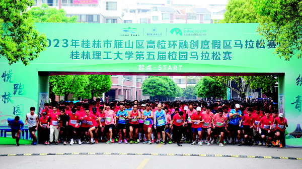 本报讯(记者李思静 文/摄)4月9日,一场“属于大学生的马拉松赛”——雁山区高校环融创度假区马拉松赛暨桂林理工大学第五届校园马拉松赛在雁山区火热开跑。随着发令枪一声脆响,来自桂林理工大学、广西师范大学、桂林旅游学院、南宁理工学院、桂林学院5所驻雁山区高校的2800余名高校大学生、教职工等从起跑点鱼贯而出,把青春活力和奋斗汗水尽情挥洒在桂林美丽的春天里。