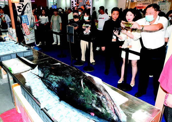 ▲4月12日,观众在消博会拍摄展出的金枪鱼。