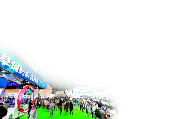 这是消博会上新西兰两大奶粉品牌高培(左)和荷仕兰的展台(4月12日摄)。