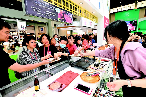 ▲4月12日,参观者在消博会的一家展台品尝进口牛排。