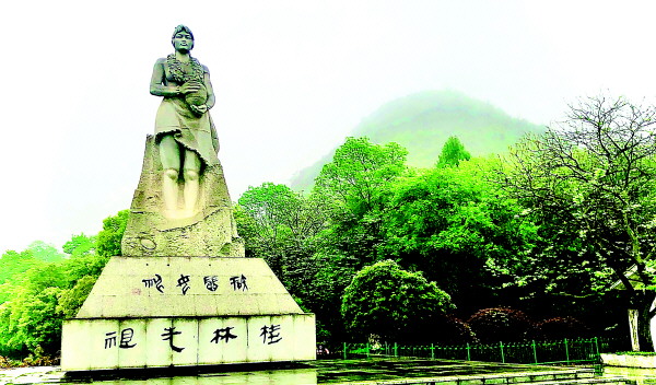 图①:根据考古资料塑造的桂林先祖形象——智慧女神。女神雕像后方的山峰即为甑皮岩所在的独山。