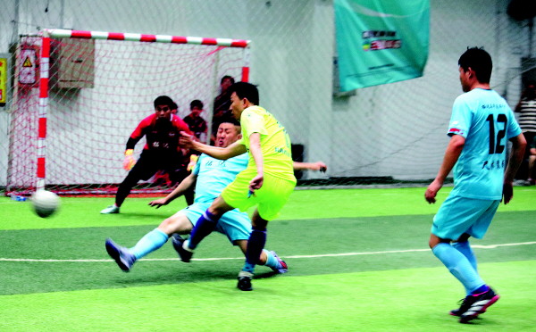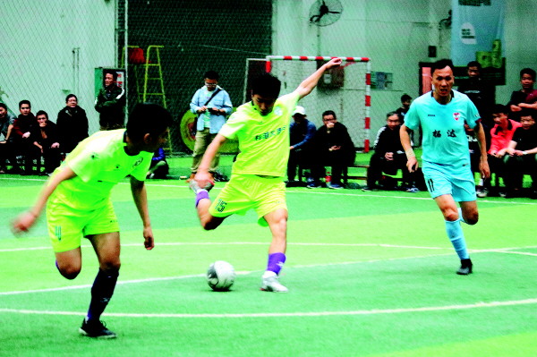 杉湖大酒店·天龙球会队员在拓达队员的包夹下起脚打门。