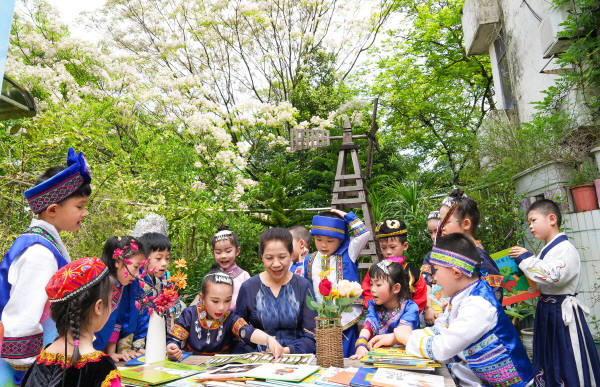 ▲4月19日,桂林市机关幼儿园举办第九届读书节,小朋友们在春光明媚的小花园里跟着老师一起读书、看绘本,享受读书之乐。