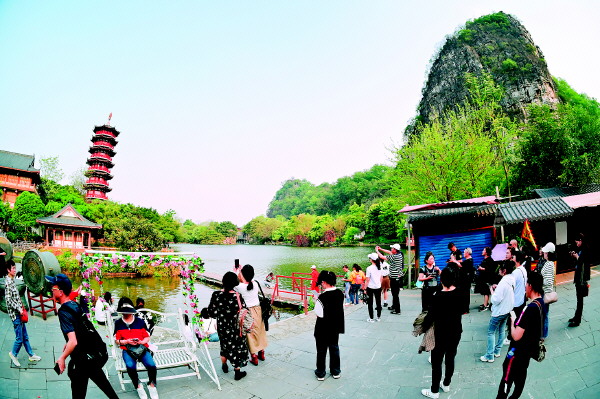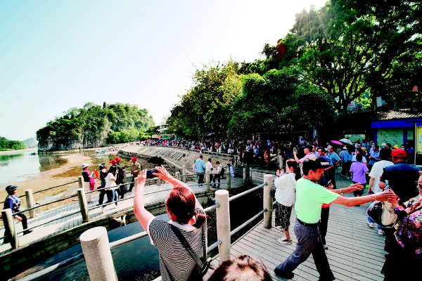 桂林市的城徽象鼻山坐落于象山公园内。象山景区自1986年成立以来,每年接待国内外游客达300万人次以上。去年春天,象山景区正式对广大游客免费开放。一年后的今天,旅游复苏的春风吹过,这里自然是最先回暖的地方。4月中旬的一个周末,记者在象山景区看到,无论是入口还是出口都挤满了游客。对此情景,象山景区管理处党支部书记莫海感慨万千:“景区免费开放一年多,对于桂林旅游复苏的助推效果显而易见。”据她介绍,今年以来景区接待游客150万人次,同比增长700%,比2019年同期增长300%;周边的餐饮、住宿、娱乐等业态也受益于象山景区免费开放,生意火爆。