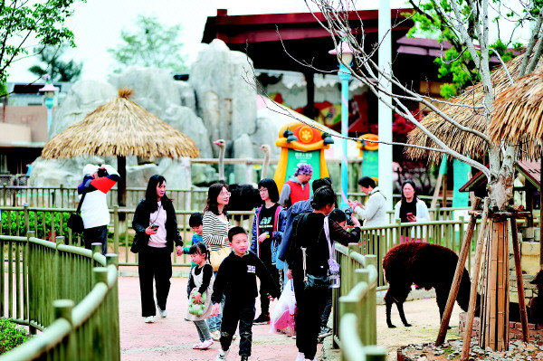 ▲游客在融创旅游度假区海世界主题公园内的动物园拍照参观。