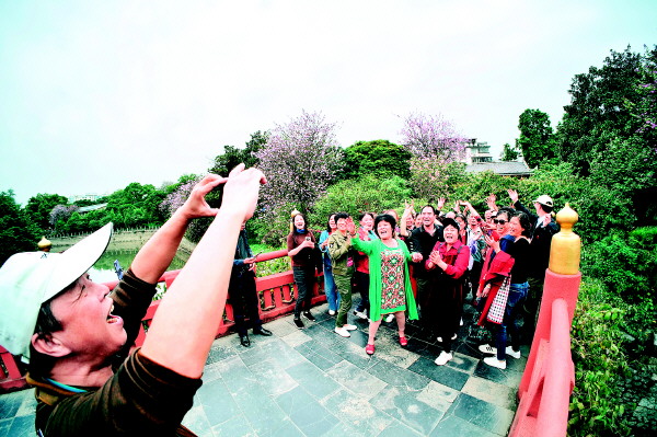 ▲南溪山公园内,一批来自广东的游客在美景前欢歌留影。